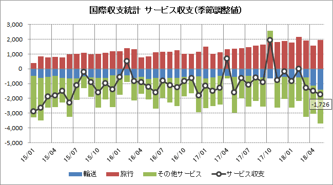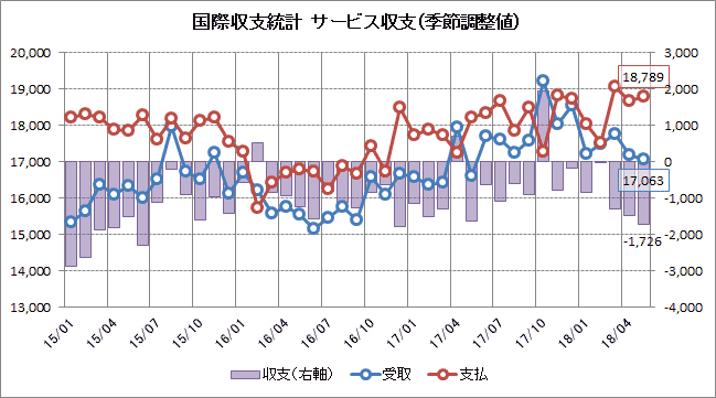 サービス収支(1726億円の赤字)は7ヶ月連続で赤字となりました。受取額(1兆7063億円)が2ヶ月連続で減少し、支払額(1兆7885億円)は2ヶ月ぶりに増加しています。