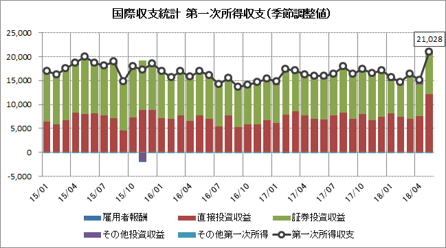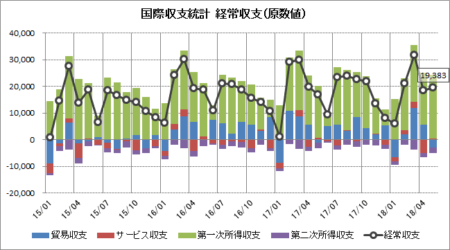 5月の経常収支(原数値)は1兆9383億円の黒字と47ヶ月連続で黒字となりました。前年同月と比べると第一次所得収支が黒字幅を拡大、市場予想(1兆2260億円の黒字)を上回っています。