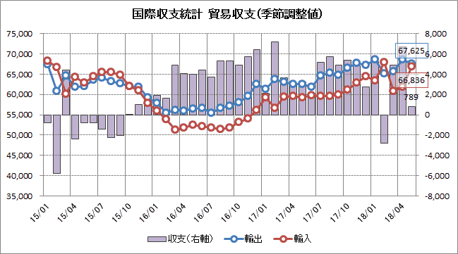 内訳をみると貿易収支(789億円の黒字)は前月から黒字幅を縮小しましたが3ヶ月連続で黒字となりました。輸出(6兆7625億円)が3ヶ月ぶりに減少したのに対し輸入(6兆6836億円)は2ヶ月連続で増加しています。